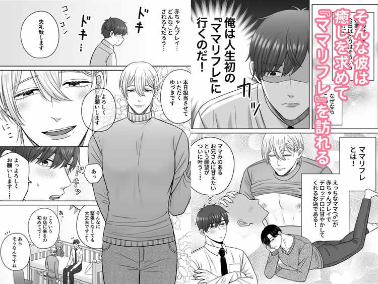 上司や先輩から仕事を押しつけられて残業ばかりの日々を送る社畜・須田渉(25)。そんな彼が癒しを求めてやってきたのがママリフレ。エッチなママ♂が赤ちゃんプレイでよしよししながら甘やかしてくれるゲイ向けの風俗店である。母性溢れるママみたっぷりのお兄さんに優しく褒められながら授乳手コキ・ローションガーゼ・尿道責めで攻められる夢のようなプレイが満載。射精や潮吹きすれば「よしよし」してくれるママリフレ♂でアナルも掘られてストレス解消。