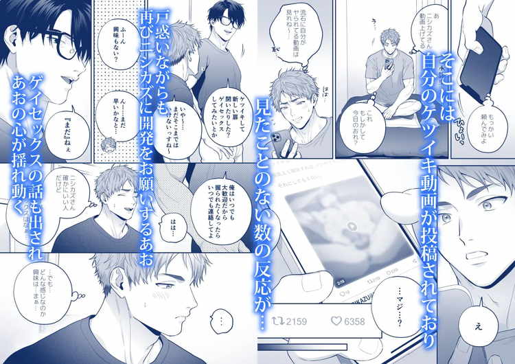 筋肉の描写や絡みのシーンなど、高い画力とストーリーが高評価の人気BL漫画。半年間のアナル開発によってアナニーでメスイキを覚えたノンケ・あお。しかし、それからというもの上手くお尻でイクことができず、有名調教師・ニシカズにアドバイスを求めることに。そこで入念な全身マッサージとアナル攻めで開発され、再び前立腺で絶頂する事に成功。あおの好奇心と性欲は尽きることなく、次はゲイセックスによるアナル生挿入を求めて裏垢ゲイ男子に堕ちてゆくBLストーリー。エロさ満点の超人気作品。アナルから溢れる精子は必見。
