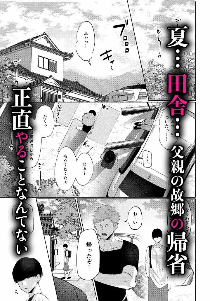 夏といえば田舎に帰省。そこには昔よく遊んでくれた親戚の叔父さん・真澄さんがいる。プリッとした雄っぱいとムチムチのお尻で、まるでこちらを誘っているかのような真澄さんの肉体。こちらに背を向けてデカ尻を突き出したところで襲う甥っ子もなかなかヤバイですね。叔父の方言や嫌がりながらもしっかり感じてる姿、メスっぽい身体など見どころ満点。親戚のおじさんとの近親BL漫画です。性欲のままに動く甥っ子の攻めが凄い。
