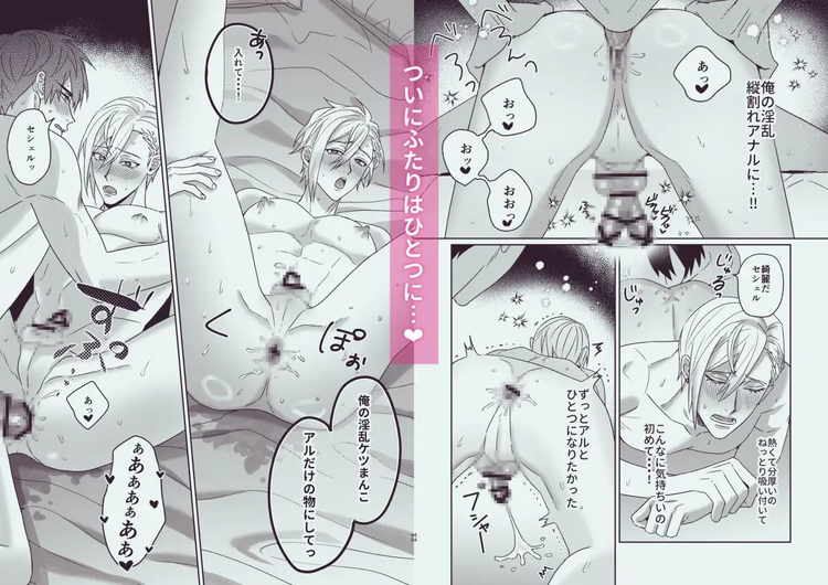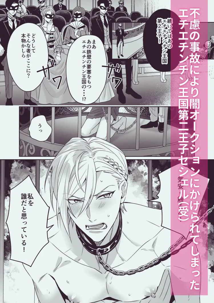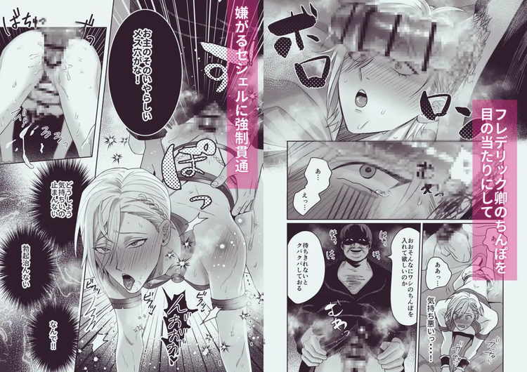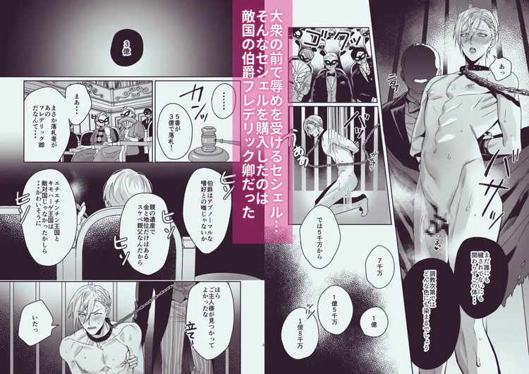 モブおじさんに攻められた後は、片想いの幼馴染に攻められてハッピーエンドを迎えるBL漫画。闇オークションにかけられたのは、若く気高く美しいエチエチンチン王国第2王子のセシェル。全裸のまま首輪を付けられた状態でも王子の威厳とプライドを忘れていません。こういう気が強い可愛いオスを攻めるのが大好きなゲイおじさんたちは結構います。そして、彼を落札したのは敵国のフレデリック卿。アブノーマルな趣味を持つおじさんです。モブおじさんに薬を盛られ、されるがままにアナルを犯されてしまう日々。そこに助けに駆け付けたのは幼馴染で両片思いだったアルベルト。最後は大好きな人とのラブラブなセックスでハート喘ぎするほど感じさせられるセシェルでした。