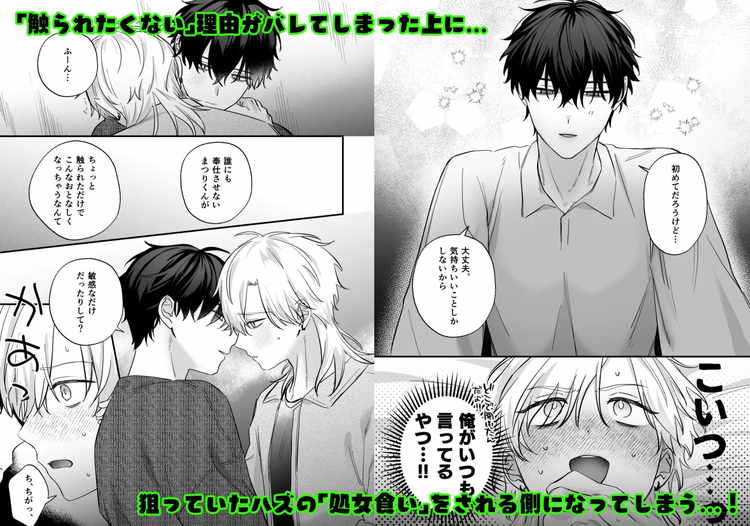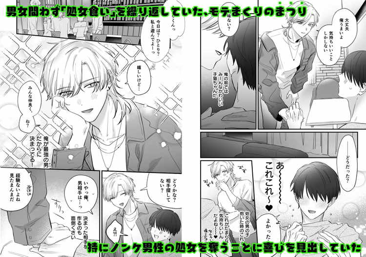 バイでタチ専のまつりは、男女問わず処女を奪っていた。その中でもノンケ男子の初アナルは特に大好物。そんなある日、バーで出会った店員の樹に目を付ける。彼の硬派でクールな態度にまつりのヤリチン魂が騒ぎ出す。日数をかけて樹を誘い出す事に成功したものの、喰われる側は自分だった年下男子攻めBL漫画。チャラいヤリチンが年下男子のテクニックに抵抗できないまま堕とされる姿はいいですね。初っ端から形勢逆転した途端にプレイボーイからメス顔になってしまうまつりくん。受けるとヨワヨワだったタチ専が高評価。