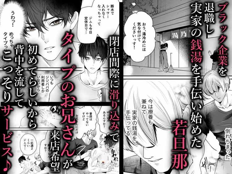実家の銭湯を手伝う息子と閉店間際にやって来たイケメンマッチョの出会いとアナルセックスを描いたBL漫画。他のお客さんが誰もいない男湯でタイプの青年と二人きり。プリプリの胸筋と背筋、引き締まったお尻に若旦那の欲望は我慢の限界。身体を洗うついでに乳首を責め、肛門に触れ、立派なイチモツをシコる手が止まらない。ついにお尻の中まで洗うサービスがあると言う言葉にノンケは驚愕。逃げ出そうとするノンケのアナルに無理矢理挿入して処女アナルが見事に開通。男湯でタイプのお兄さんを食べてしまうドスケベなストーリー。強引な挿入と乱暴な肉体関係ですが、メス堕ち一直線のエロさ満点BL漫画。