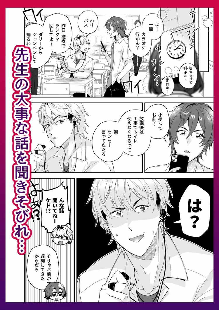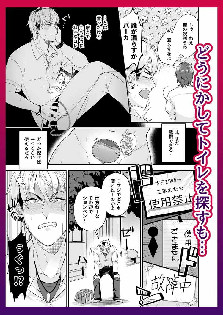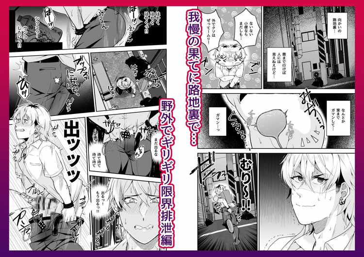 「午後から下水道工事のためトイレが使えなくなる」遅刻したため先生の話を聞いていなかったヤンキー・高崎一臣が失禁と脱糞の危機に陥ってしまうBL漫画。学校で小便をして帰ろうとした時に初めてトイレが使えない事に気づかされた高崎。すでに膀胱は容量いっぱい間近。そんな時に限って襲い来る便意。尿道と肛門をめいっぱい締めてトイレを探して彷徨うが見当たらず我慢の限界。アナルから漏れる屁、先っぽから漏れる尿、股間を抑えて耐え続けるヤンキーの姿が見どころ。おしっことうんこはどこに解き放たれるのか!?