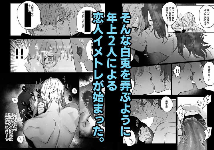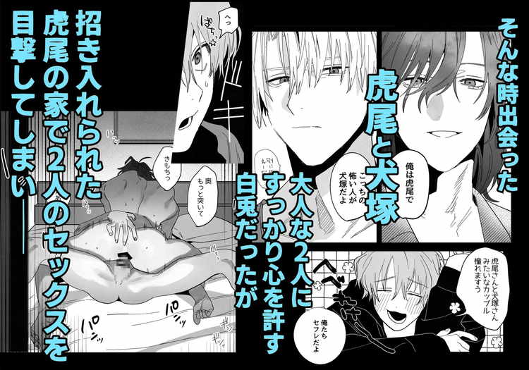 恋愛未経験で童貞処女の大学生・白兎。恋人探しのために訪れた場所で出会った二人のお兄さん(セフレカップル)虎尾と犬塚に誘われるがまま男同士の3Pを体験する事になるBL漫画。虎尾と犬塚のセックスを目撃し、盗み見していたことがバレて強引な流れでアナル処女を奪われる白兎くん。初めてのキス、初めてのフェラ、初めての二輪挿しなど、一晩であらゆるゲイプレイの快楽に堕ちてゆく。初体験が二人のイケメンお兄さんとの3Pというのは一生の思い出になりそうです。