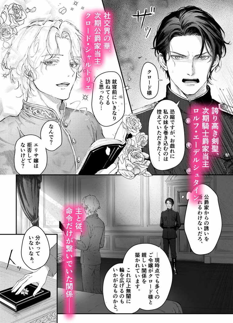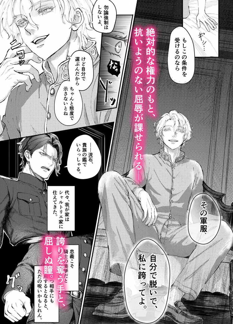 次期侯爵家当主・クロードとその護衛を担う誇り高き剣聖・ロルフ。二人は絶対的な主従関係にあった。しかし、刺激を求めるクロードの矛先はロルフに向けられる。大切な妹を守るために取引に応じるロルフ。確かな実力で剣聖の地位に上り詰めたロルフの鍛え上げられた肉体を求め、性行為を強いるクロード。乳首を入念に弄ばれ、無理矢理アナルをこじ開けられる快楽に抗う騎士。「絶対に堕ちない」という気持ちを前面に押し出した表情と、快楽に飲まれそうになる寸前の喘ぎ声。そのバランスが素晴らしい主君と騎士の主従BL漫画です。ファンタジーと男同士のエロスが見事に融合した絵柄も高評価。