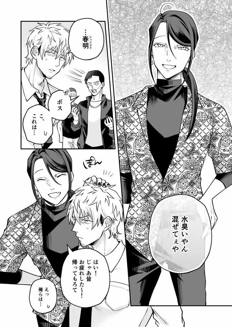 潜入捜査官ということがバレてしまい捕らわれの身となった辰彦。椅子に拘束されて身動きできない彼の前に現れたのはマフィアのボス・春明。気に入ったものは絶対に手に入れる春明は快楽責めで辰彦を堕としにかかる。おじさんの不良刑事がノリの軽いヤバイ奴に全身を弄ばれる画は良いですね。フェラチオやアナルを掘られて快楽を叩き込まれながらも、反抗的な態度で気丈に対応する辰彦。しかし、無理矢理飲まされた媚薬の効果によって次第に崩れゆく精神力。執着拷問の快楽に抗う強気受けを描いた裏社会BL漫画。