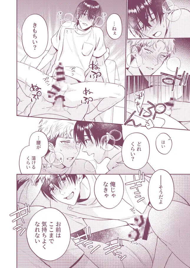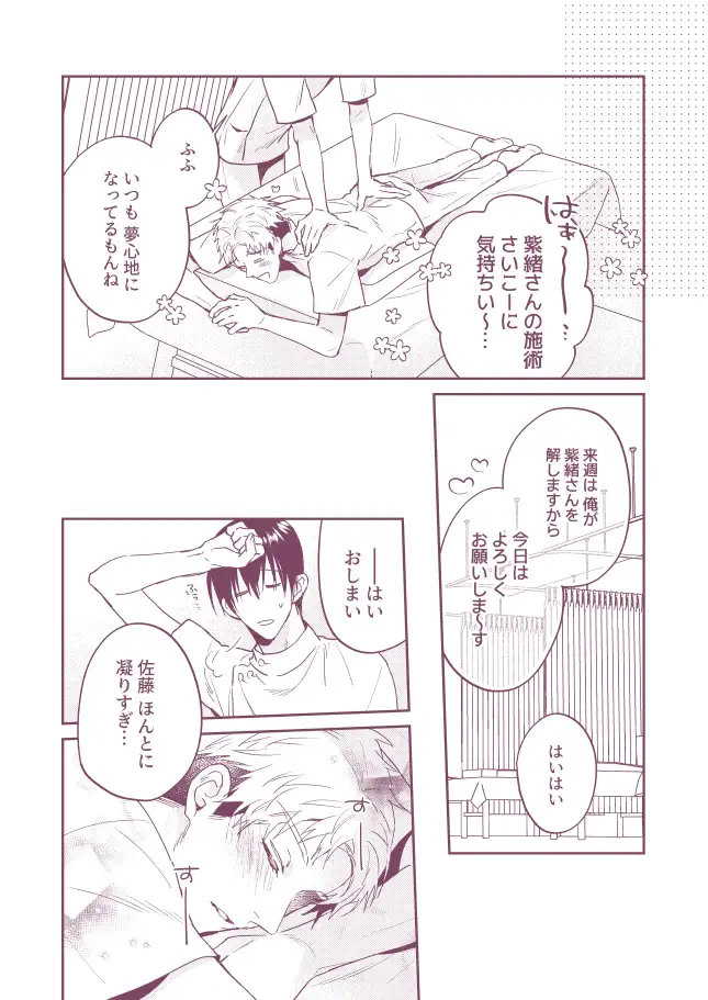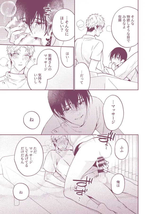 マッサージからアナルセックスへ。マッサージ師の先輩と後輩が催眠アプリを使ってアナルセックスに持ち込むBL漫画。優しくて爽やかな先輩が勃起した男性器をブランブラン揺らしながら後輩の上で腰を振る。そして、されるがままにアナルで射精させられる後輩。両片思いの男子二人が催眠アプリを使って己の性欲を満たすハッピーエンド展開。
