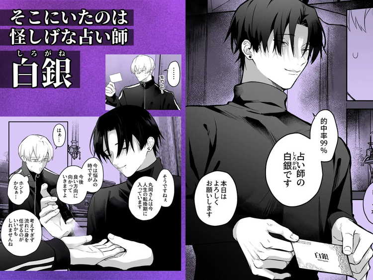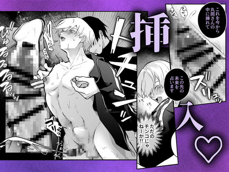 就活がうまくいっていない綾人くんが立ち寄ったのは占いの館。中に入ってみると現れたのは怪しげな雰囲気を醸し出す占い師・白銀。最初は手相占いを試みる白銀だったが、乳首占いへと移行。乳首の相を見てもらっているうちに、それは乳首への愛撫へと変わってゆく。おもちゃで突かれ、ローションでまさぐられるとムクムクと立ち上がりだす股間のふくらみ。どんどん敏感になった体は、アナルを簡単に差し出してしまうほどユルユルになっていた。乳首責めからアナルセックスへと発展し、ゲイプレイの快楽を知ってしまうノンケのBL漫画です。男性器の先っぽから精液を垂れ流しながらハメられてる画がエッチです。