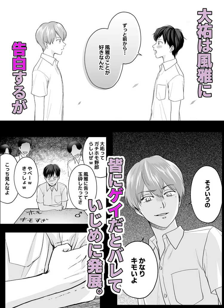 中学生だった大祐が好きだった男子・風雅に告白。しかし、振られた挙句みんなにその話を広められてゲイということでいじめられることに。それから不登校になってしまった大祐は人気ゲーム配信者としてひっそりと生きていた。そんなこんなでやってきた成人式。20歳になった大祐は、偶然コンビニで風雅と遭遇。チャラいヤンキーになっていた風雅が、とあることで大祐に弱みを握られて逆襲を受け入れさせられる逆襲BL漫画。陽キャが陰キャにがっつり弄られ、アナルを開通させられています。続編が求められている人気作品。