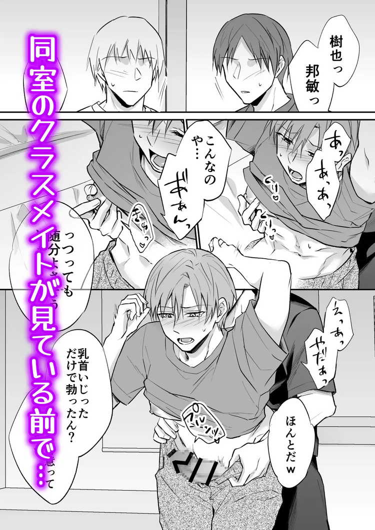 修学旅行で義隆に告白しようとしていた彰。しかし、義隆は彼女のもとへ行ってしまう。修学旅行の夜ですからね、普通のノンケ男子なら彼女とこっそり逢引するのは当然です。そのことに深く傷ついていた彰のそばに寄ってきたのは前々から事情を知っていた孝充だった。慰めと称して強引に乳首を弄り、無理矢理体を弄ぶ孝充。素直に反応してしまう彰の肉体を見ていた同部屋の男子たちもその気になってしまい複数プレイへと発展。修学旅行の夜に同部屋の男子たちと肉体関係を持ってしまったゲイ男子のBL漫画。シチュエーションがめちゃくちゃ興奮しますね。それにしても、乳首を攻められ勃起して、友達の前でアナルを掘られて絶頂する健気受けの彰くんがチョロすぎる。これからも性処理アナルとして活用されそうです。