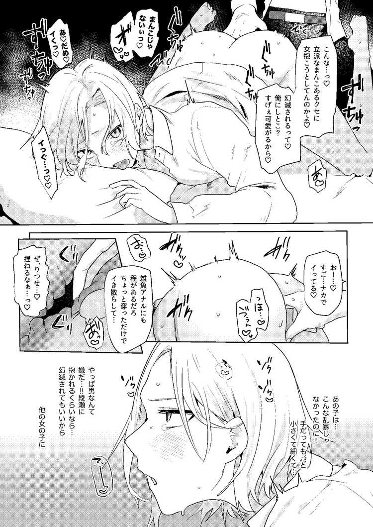 彼女に全身を開発されて立派な受けになってしまった伊吹。その彼女と破局したことが親友の綾瀬渉にばれてしまった。実はこの綾瀬、大学時代から伊吹に片思いしているゲイだった。彼女と別れた伊吹を、お酒で酔った勢いで何とかしようとたくらむ綾瀬。その作戦は見事成功。乳首とアナルで抜群に感じてしまう伊吹は、綾瀬の強引なリードによってアナルセックスを強いられてしまう。男は嫌だと思いながらも開発された肉体はとても正直。男友達とのアナルセックスでマジイキしてしまうBL漫画です。