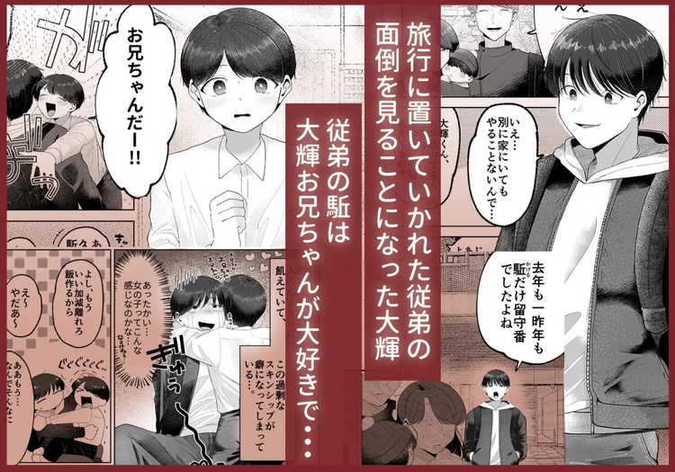 大学生の大輝は家族旅行に置いて行かれた駆の面倒を見るために少しの間いっしょに暮らすことに。学校ではイジメに遭い、家族にも愛されていない駆にとって大輝は救世主のような憧れのお兄ちゃん。しかし、いつしか憧れを越えて性的な欲求を満たしてくれるほど大きな存在になっていた。大輝を想い浮かべながらアナニー(アナルオナニー)に没頭する姿を目撃してしまった大輝は、そのエロさに衝撃を受けて雄として奮い立ってしまう。あたたかくて可愛い従弟の小さな体の虜になった大輝は夢中でアナルを突きあげる。それと同じく、大好きなお兄ちゃんと一緒に気持ちよくなれる悦びで幸せを感じる駆。両親がいない間に従兄弟同士でゲイセックスを繰り返し、愛を深め合った二人がハッピーエンドを迎える人気BL漫画。心の拠り所がいとこのお兄ちゃんしかいない健気な少年の気持ちがビンビン伝わってきます。