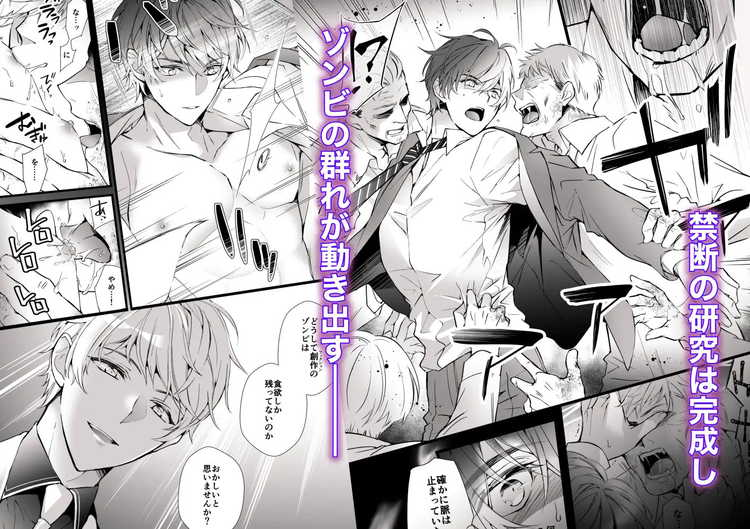 とある製薬会社の研究室でゾンビを開発していたのは大学時代の後輩・瀬名だった。それを告発し、混沌の世界の到来を阻止することに成功した最上。しかし、瀬名の研究は終わってはいなかった。本作のゾンビは人間の血肉を求めるのではなく、性欲を発散するために動き回るゾンビ。主人公である最上に快楽を叩き込む役目を担っています。性欲ゾンビの集団に肉体を凌辱されるモブレでは、潮吹きや結腸責めや腹ボコなどのハードな攻めが満載。綺麗な絵柄で雄の快楽に堕とされてゆくBL漫画です。