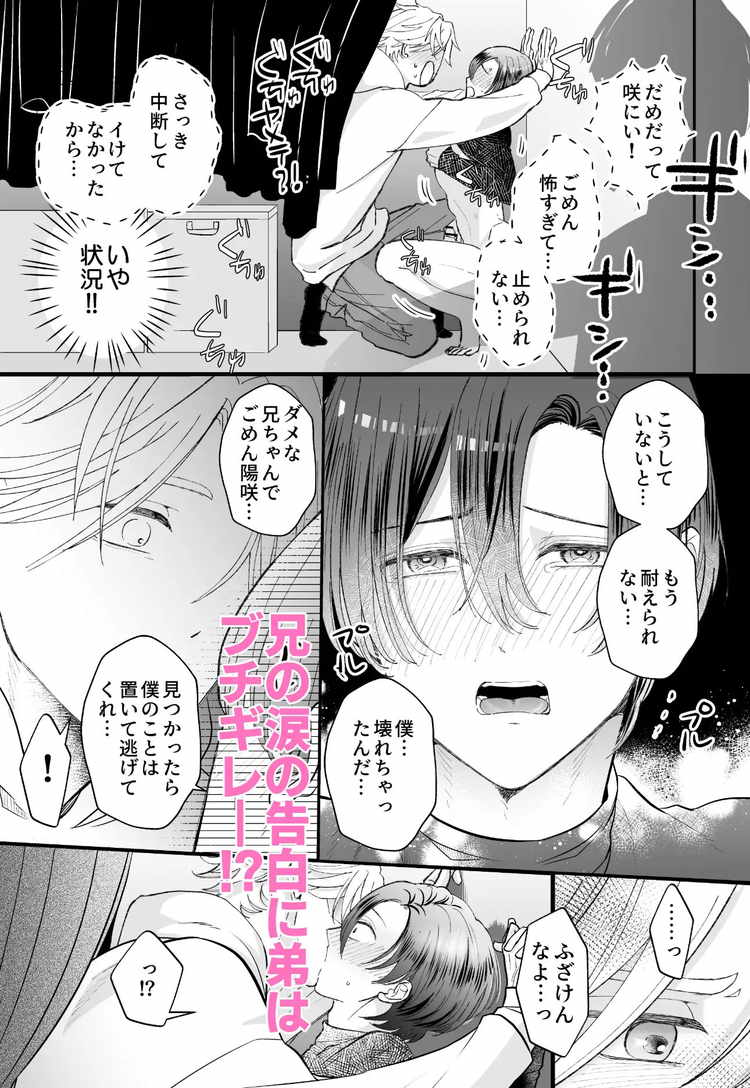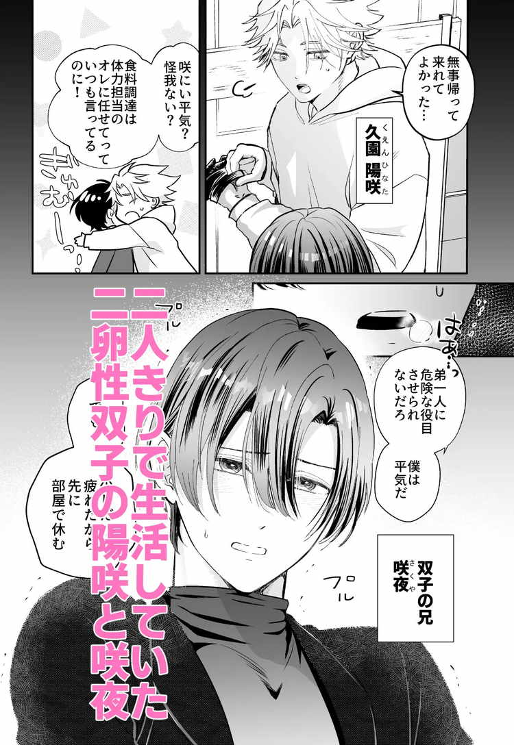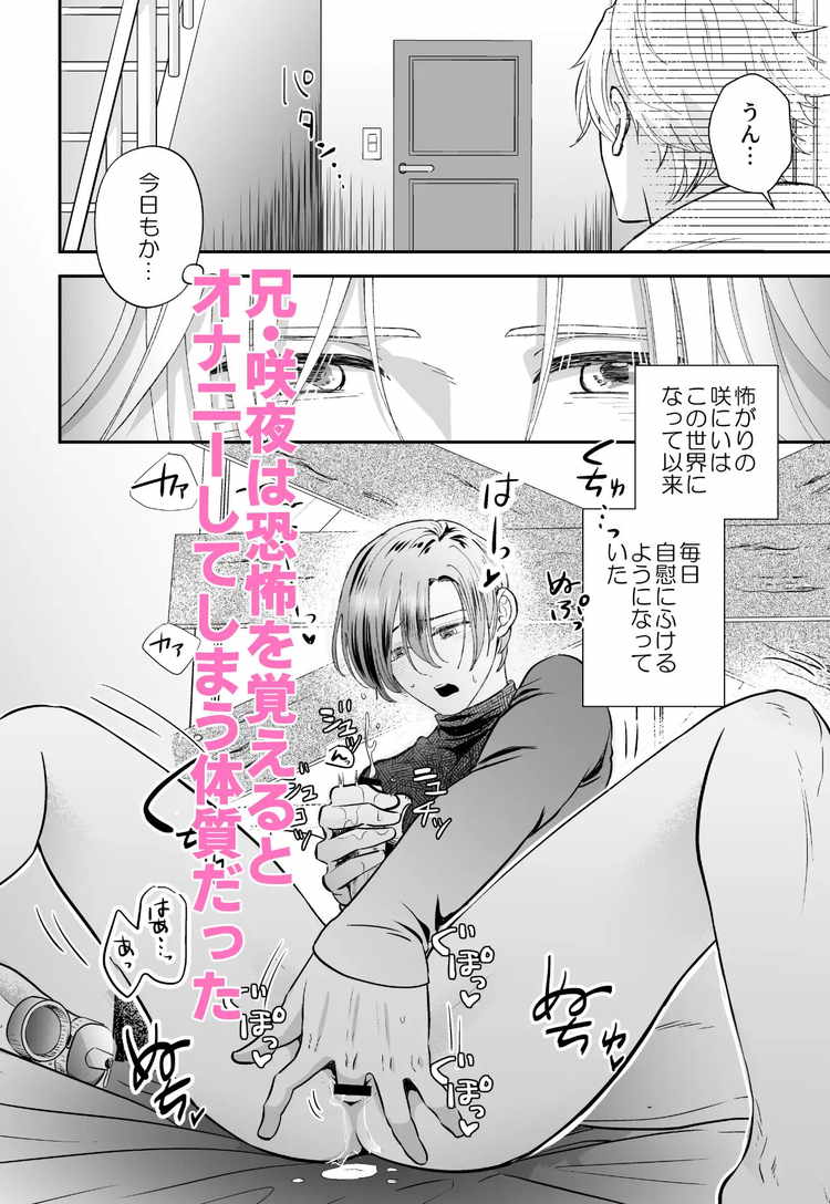 人々がゾンビに変貌した世界で生き延びた双子兄弟。怖がりで優しい兄の咲夜と活発で兄想いの弟の陽咲は二人きりで空家を転々としながら何とか生きていた。ある日、ゾンビが家に侵入していることに気づいた弟は、兄のいる部屋へ飛び込む。そこには恐怖から逃れるためにオナニーしている兄の姿が。身を潜めて隠れる二人だったが兄のオナニーが止まらない。そこから、双子の想いが肉体関係へと発展してゆくBL漫画。愛する兄を恐怖から救うために性的興奮を与え、アナルセックスで突きあげる弟・陽咲。相性の良い弟の男根を肛門でくわえ込みながらさらなる快楽を求める兄・咲夜。双子の兄弟がゾンビがはびこる世界でラブラブなセックスで幸せを手に入れるBL漫画です。