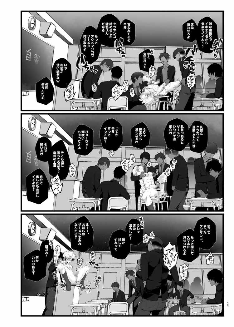 「痴漢電車で晒される恥辱の身体編」にて淫紋わからせプレイで快楽に堕ちた辛井くん。今回はクラスメイトのみんなにアナルを使いまわされるお話。制服の下の筋肉質な体と異常に発達した胸筋(雄っぱい)にクラスの男子も興奮気味。乳首をひねると精子を垂れ流すトコロテン体質、雑な腰使いでイキまくる雑魚アナル、イキ続けて潮吹きが止まらない下半身。教室で壮絶なアナルセックスが繰り広げられるBL漫画です。屈辱を味わうたびに締まりが良くなるお尻に開発されてしまった辛井くんでした。表情と身体とシチュエーションがエロい人気作品。いつも強気なヤンキーの無様なイキ顔が楽しめます。