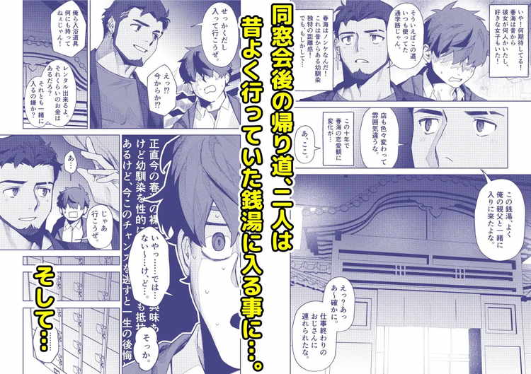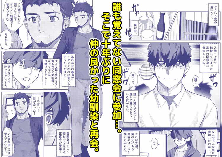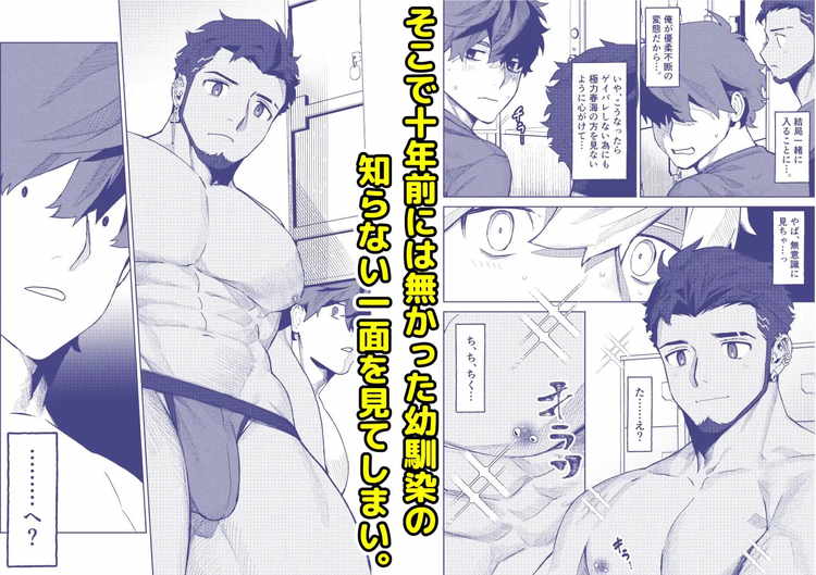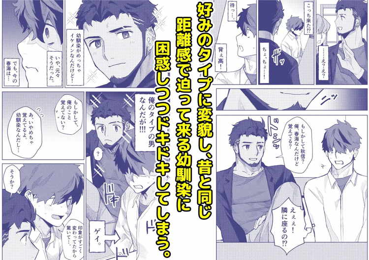 同窓会で十年ぶりの再会を果たした秋信と春海。イケメン美容師として有名になった春海に翻弄されるゲイの秋信を描いたBL漫画。ピアスを開けヒゲを生やし、ワイルドでありながら爽やかなイケメン春海は秋信にとってドストライクの男。そんな彼に銭湯に誘われ、露になった褐色のマッチョとモッコリに視線が奪われる。無自覚にゲイを欲情させ、誘っているかのようなノンケは恐ろしい存在です。幼馴染への興奮が止まらず、理性崩壊寸前の生き地獄を味わうゲイのストーリー。