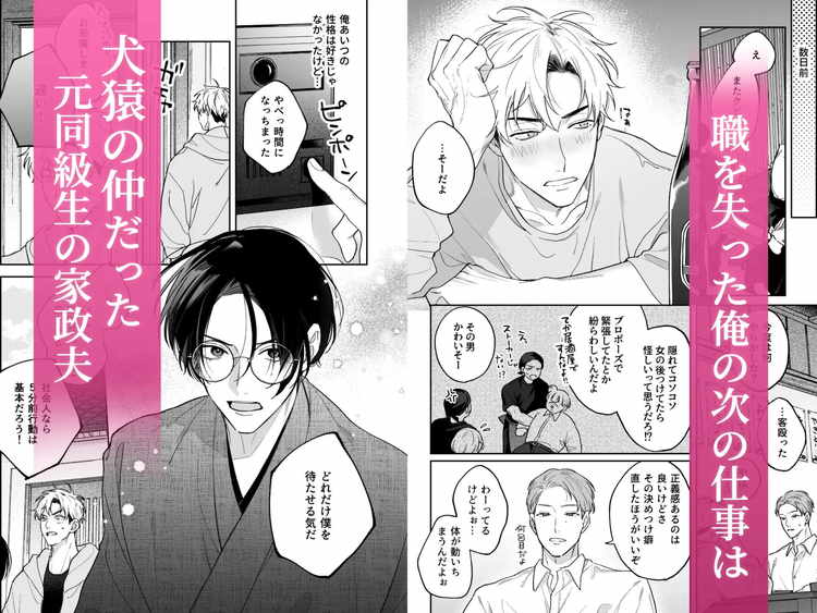 まっすぐな性格が仇になり、仕事をクビになった早川嵐。友人が彼に紹介した次の職場は、犬猿の仲だった元同級生の家政夫。久しぶりの再会なのに、相変わらず上から目線の嫌味なやつだった柚木千景。そして、雇い主と家政夫という関係になった元同級生の男たち。ある日、早川が掃除中に見つけたのは大人のおもちゃ。しかもアナルに挿入するやつ。その近くには自分の写真が。自分を俺をおかずにしてアナルオナニーしていた柚木に詰め寄り、アナルセックスを強いる早川。高身長の早川に迫られ、激しいアナルセックスでメスにされてしまう柚木。いつも強気な同級生が無理矢理の体格差セックスでアナルに中出しされるBL漫画です。