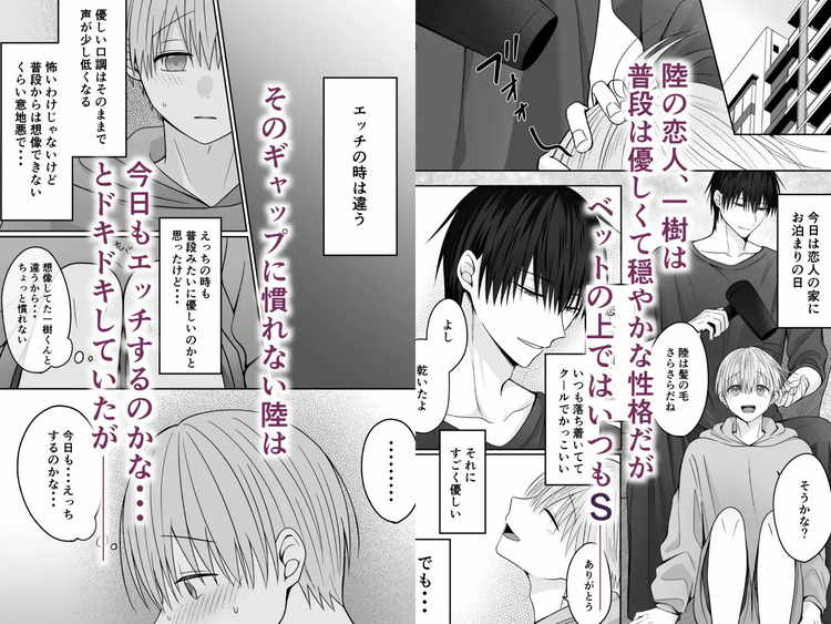 普段は優しいけどベッドの上ではSになる一樹。今日はどんなエッチをするのだろうと不安を感じながらもドキドキが止まらない陸。「今日はマッサージしてあげよっか」一樹からの意外な提案に驚きながらも体を委ねることに。始まりは普通のマッサージだったが、どんどん敏感なところに指が伸びてきて反応してしまう陸の体。素直に勃起してしまった陸をさらに気持ちよくしようと一樹はおもちゃを使ったエッチなマッサージを開始。それは、尿道と前立腺を入念に攻める内容だった。意地悪な言葉を囁きながら乳首を弄り、尿道プラグで快感を与えられながら前立腺をゴリゴリ攻められるBL漫画です。