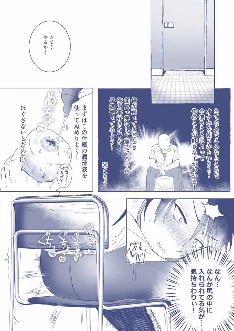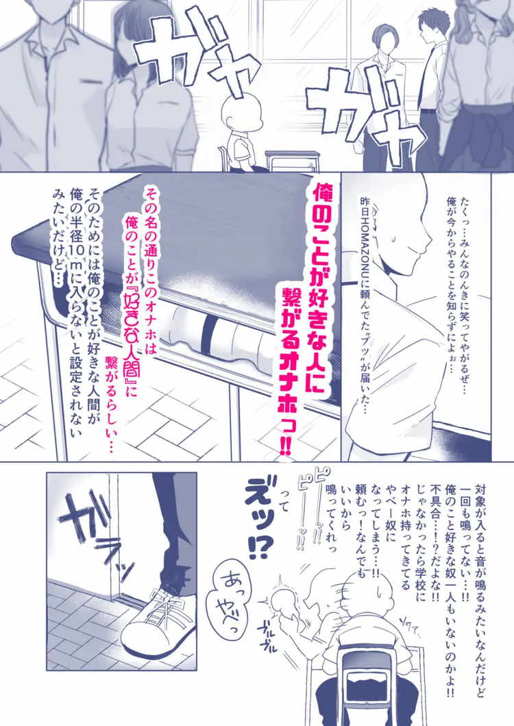 「俺のことが好きな人に繋がるオナホ」を購入した主人公。俺のことが好きな女子はいないのか?そんな不安が頭をよぎったとき、対象が範囲内に入ったことを知らせるアラームが発生。ちょうどその時、遅刻してきた男友達・山岸が挨拶してきた。今はそれどころじゃない、トイレに駆け込んでオナホを使用する主人公。そして、教室で授業を受ける山岸のアナルに違和感が。主人公がズプンと勢いよくオナホに挿入すると、山岸のアナルにドチュンと何かがねじ込まれる衝撃が。なんと主人公を好きな人は男友達の山岸だった。声を押し殺しながら、アナルを猛ピストンしてくる快楽を受け止める。クラスメイトの男友達をイカせる学生BL漫画です。